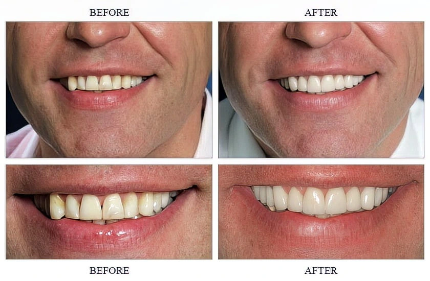 After 2 teeth broke he considered the option of rebonding the chips but decided instead on a more permanent restoration of 7 porcelain veneers and a 3 tooth porcelain bridge on his upper front and side teeth.
