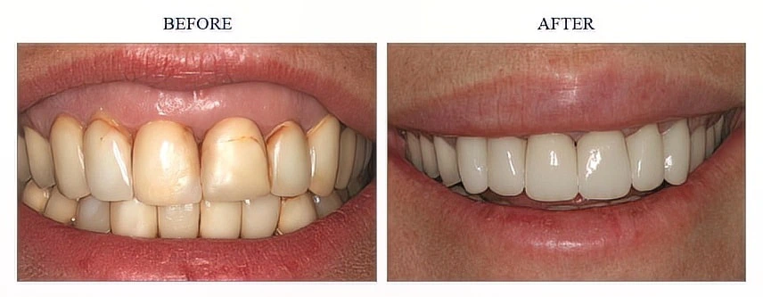 Years ago Martina had her 6 front teeth bonded with composite (plastic) veneers and over the years they chipped and discolored, especially at the edges. After restoring her back teeth, it was finally time to transform her stained smile. We placed 6 porcelain veneers on her upper front teeth in 2 visits, and the results speak for themselves. The teeth are very comfortable and Martina is thrilled!